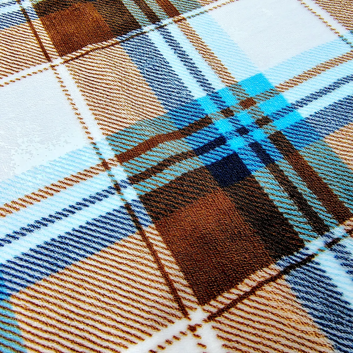 Rollo de Tela Polar Alaska con diseño de cuadros Perú en color azul y café. Tejido suave, cálido y versátil, ideal para confeccionar prendas de invierno y accesorios para el hogar. 100 % poliéster, 150 cm de ancho.